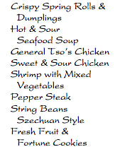 The MTSMA banquet to be at the Hunan Dynasty Restaurant on Friday, March 28 beginning at 6 pm. The restaurant's web site is: < http://www.hunandynastydc.com/ >. The menu will include the following: